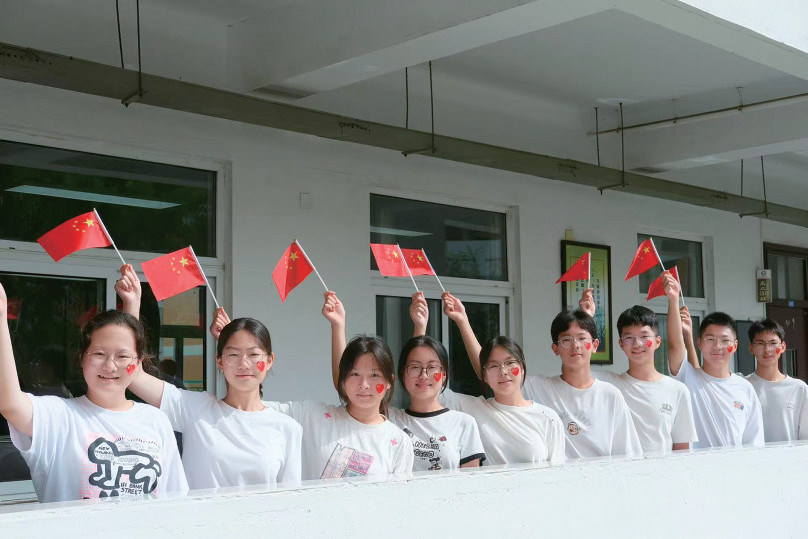 实验初中的学生们把国旗紧紧握在手心、高高举过头顶,让风捎带着青春的炽热,把对祖国的深情传遍校园的每个角落。
