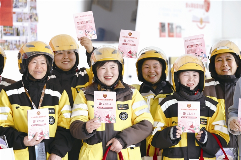 2025年3月7日,在山东省临沂市郯城县郯城街道龙泉社区,外卖女骑手展示妇联发放的妇女维权公益服务知识手册。