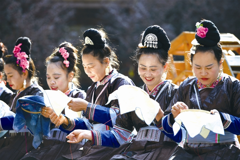 2019年3月12日,在贵州省黎平县侗品源传统工艺农民专业合作社,侗族妇女在刺绣。