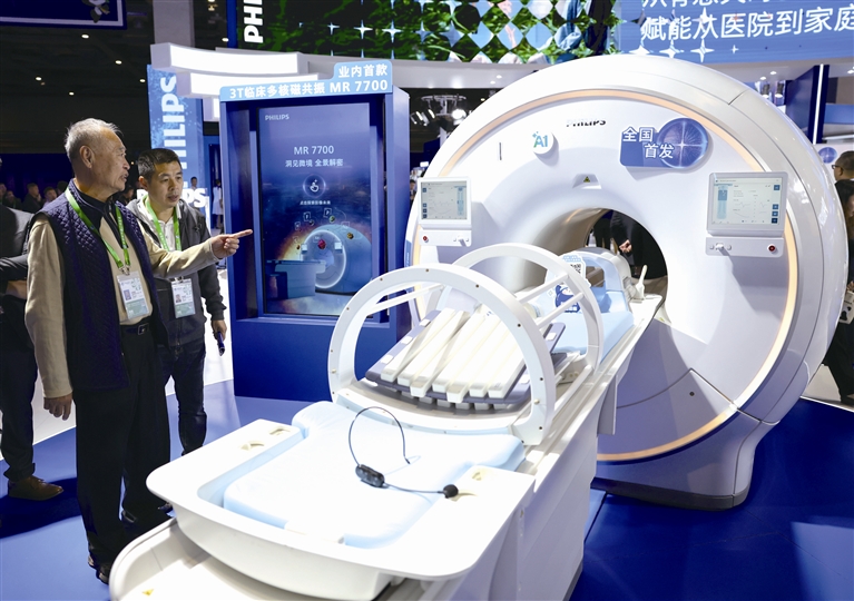 11月6日,参观者在进博会医疗器械及医药保健展区飞利浦展台了解MR7700多核磁共振设备。这是该产品在中国首发。