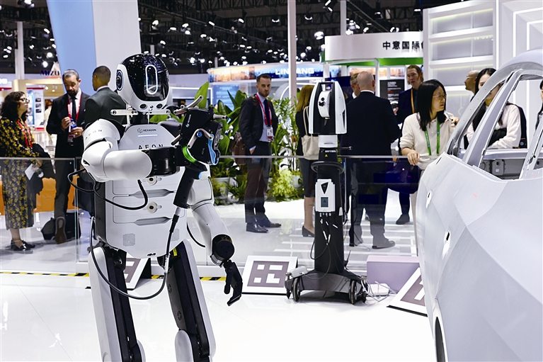 11月5日,一个海克斯康AEON工业人形机器人在展台上进行三维扫描作业演示,这也是该型号机器人工业自动化应用场景的中国首展。