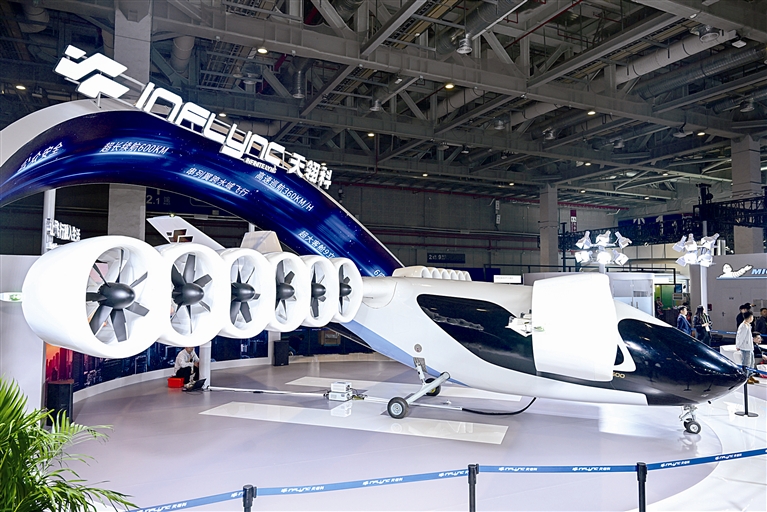 11月6日在进博会汽车及智慧出行展区天翎科展台拍摄的L600全尺寸倾转涵道翼eVTOL。这是该产品全球首发。