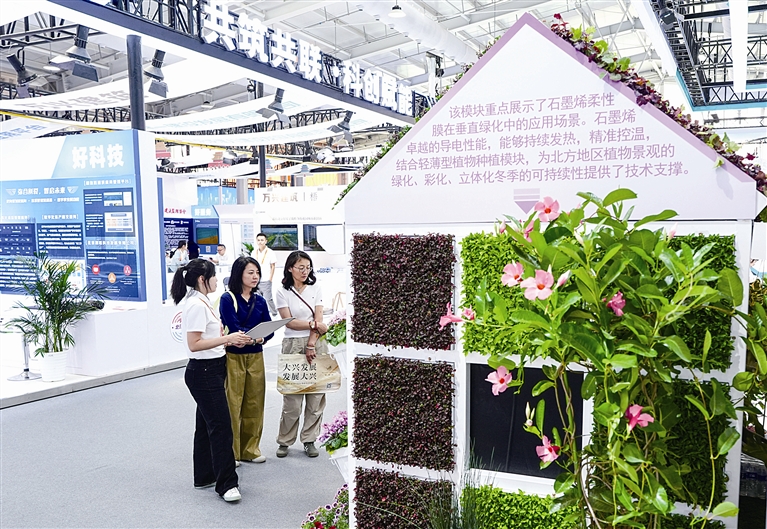 2025年9月12日,在服贸会工程咨询与建筑服务专题展区北京城建集团展位,参展商向参观者介绍建筑垂直绿化的应用。