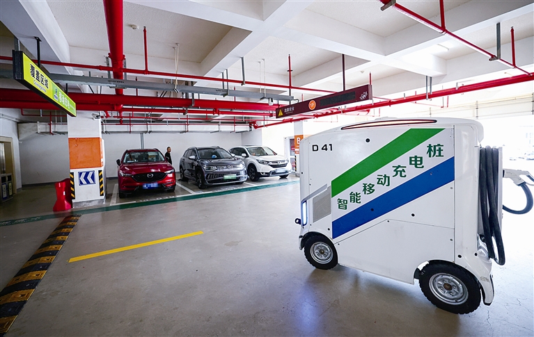 2025年10月17日,浙江舟山朱家尖蜈蚣峙码头停车场的无人充电车前往游客预约的车位提供充电服务。