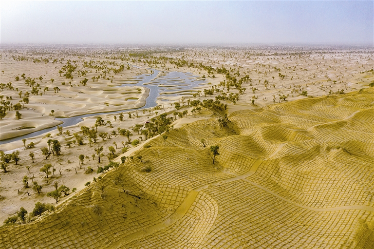 这是2025年9月19日在新疆巴音郭楞蒙古自治州尉犁县拍摄的塔里木河、野生胡杨和草方格(无人机照片)。