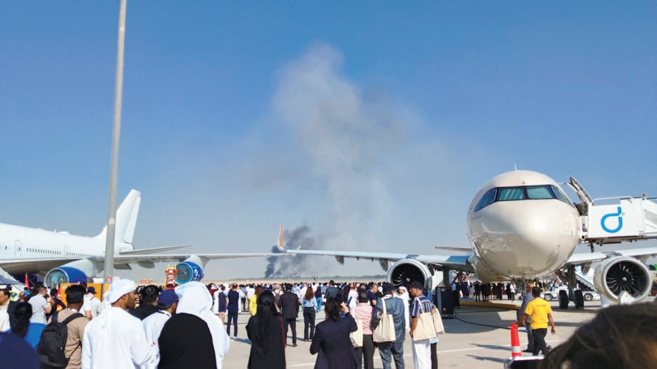 11月21日,在阿联酋迪拜,飞机坠毁现场冒出滚滚浓烟。