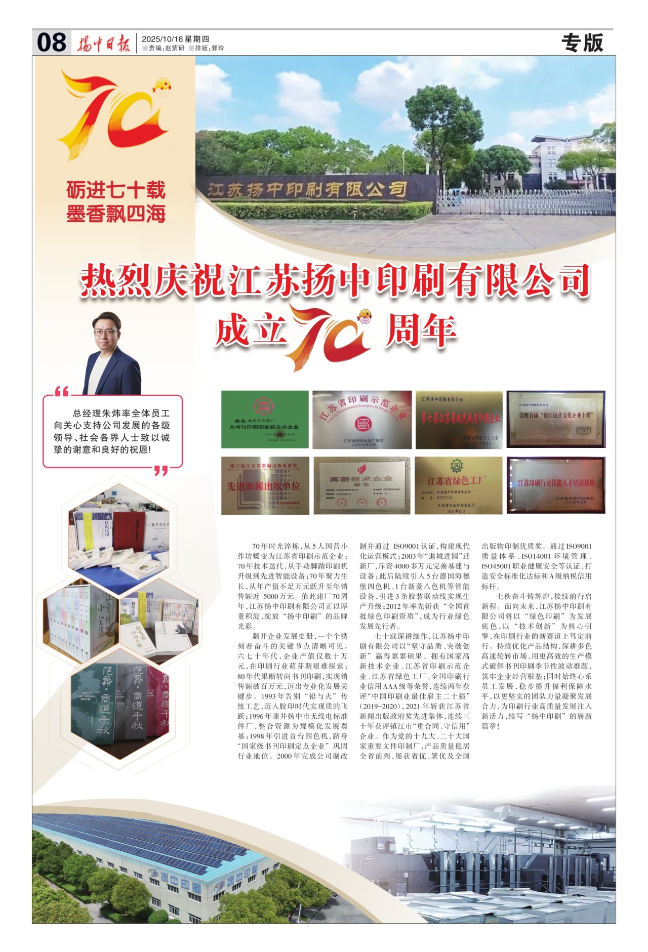 热烈庆祝江苏扬中印刷有限公司成立70周年